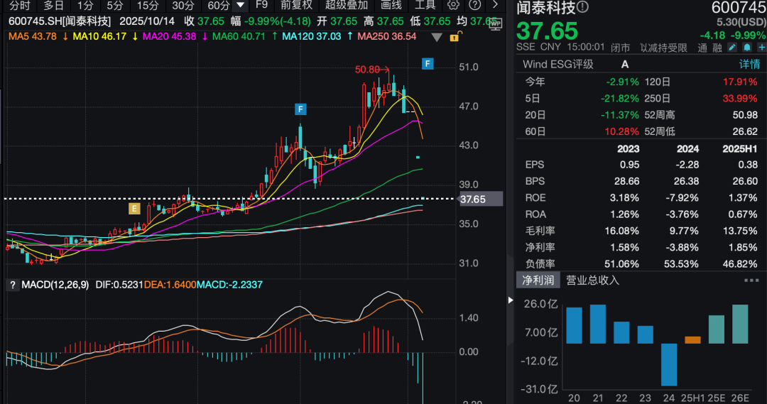 10月14日,闻泰科技股价再度跌停,这是该股复牌后的第二个跌停板。