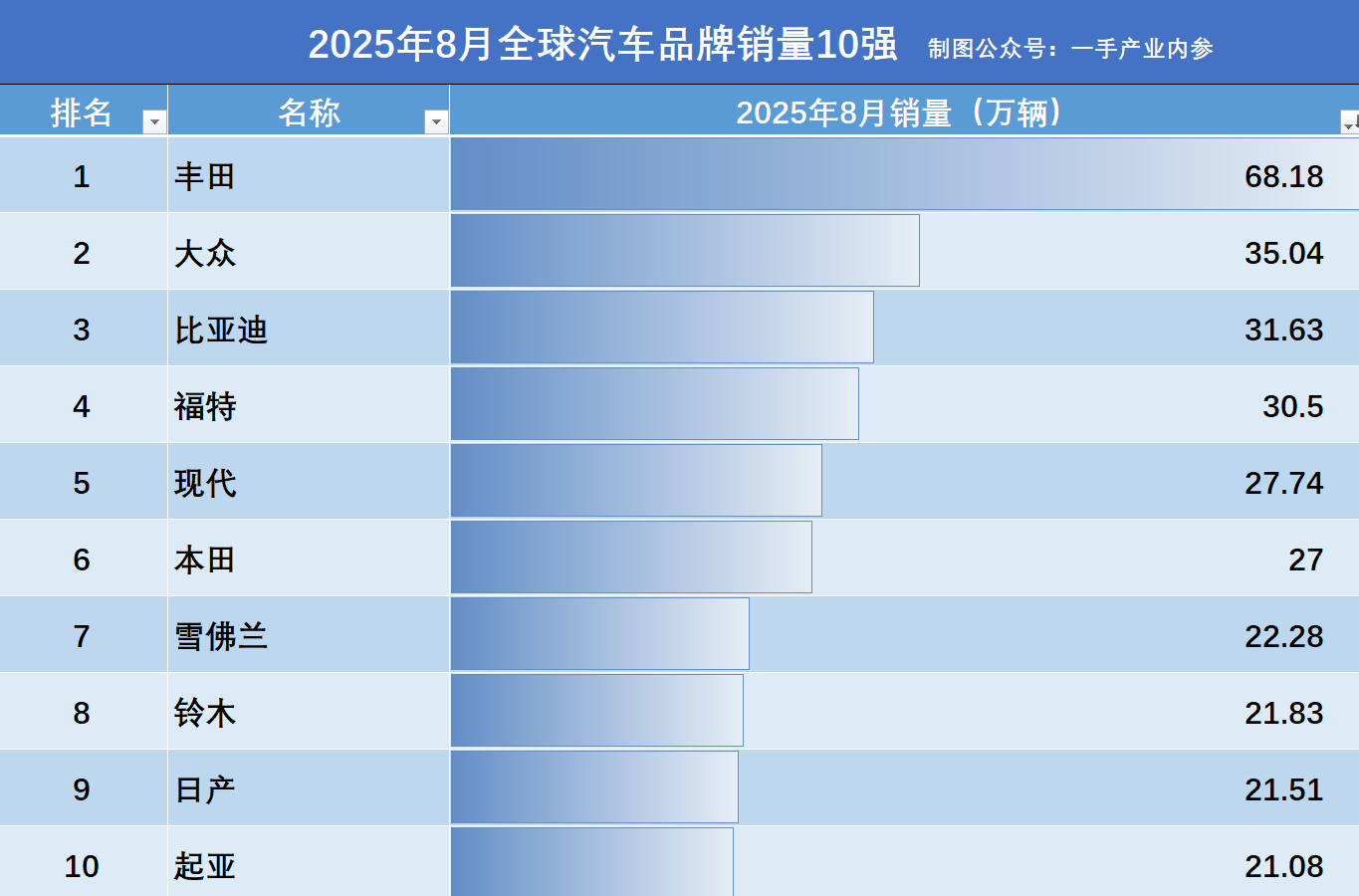 另附:2025年8月全球汽车销量10强品牌名单,数据源于:中汽数研。