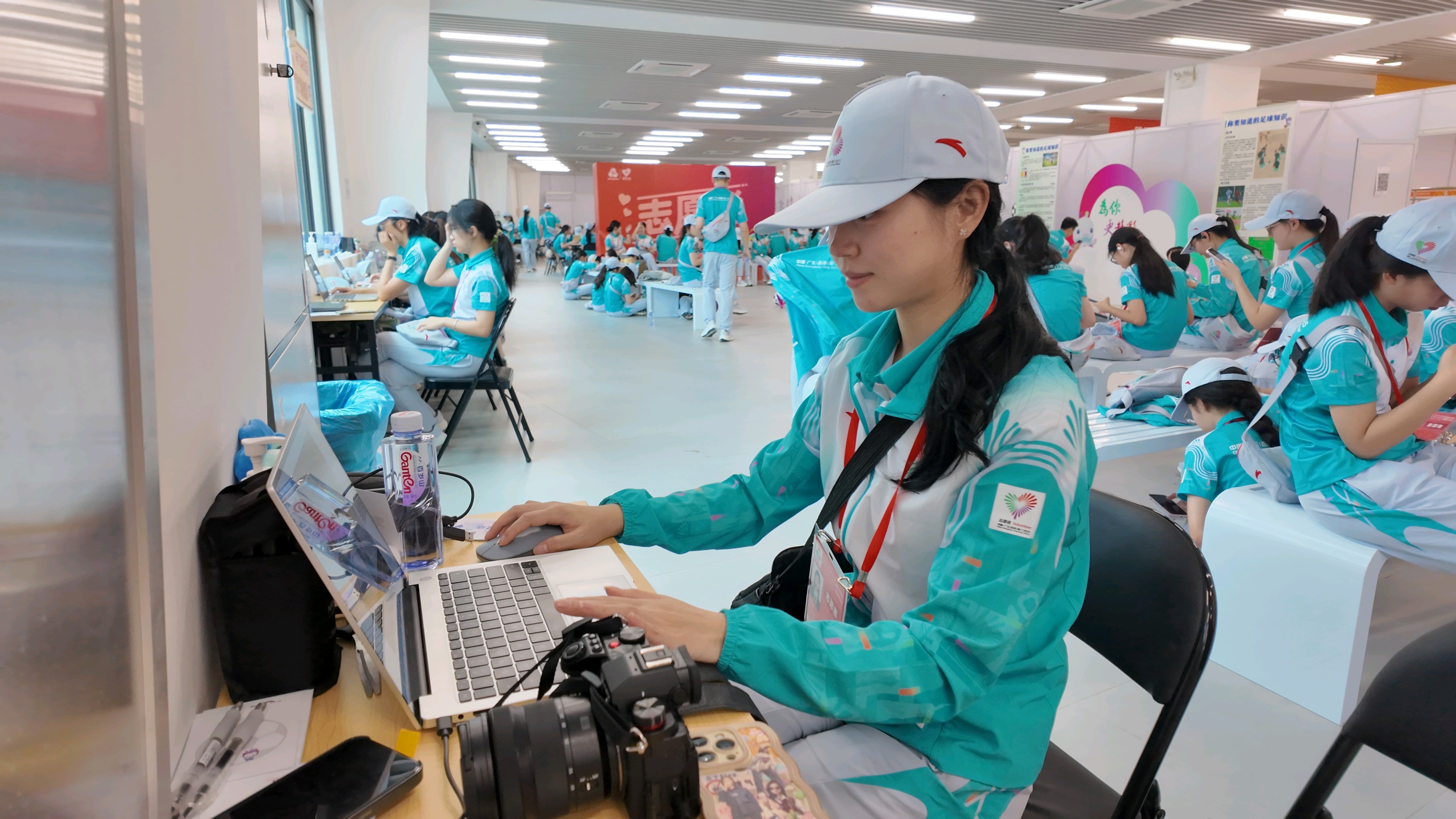 苟佳嘉是华南师范大学的一名研究生,十五运期间,她是志愿者管理与宣传组的骨干成员。每天,她的脚步都在不同岗位之间穿梭:时而在志愿者之家记录小伙伴的故事,时而剪视频、写宣传推文。