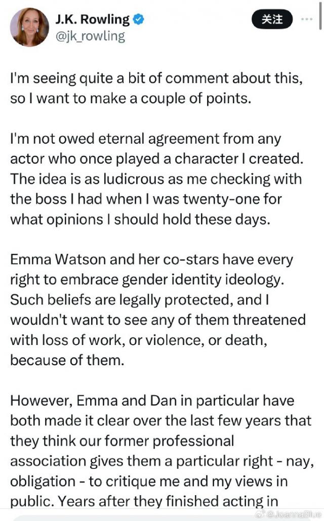 这场风波始于 2019 年罗琳关于跨性别议题的言论引发的争议。艾玛 · 沃特森当时曾公开批评罗琳,被外界视为"站队"反对一方。而罗琳在最新推文中首次披露,自己在那段时间曾遭遇死亡威胁与人身攻击,但始终对外保持沉默,未主动谈及与艾玛的分歧。