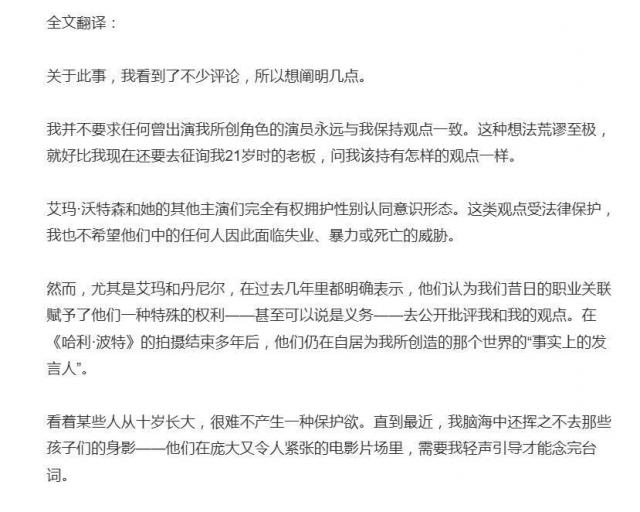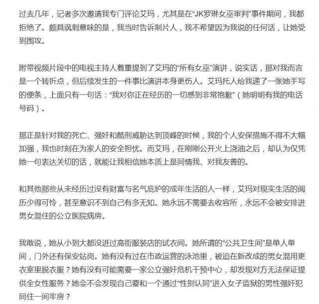 罗琳进一步直指艾玛的态度转变源于舆论转向:"她发现如今谴责我已不再时髦,才急忙想修复形象。"文中虽未直接否定艾玛的观点立场,却强烈质疑其动机与真诚——尤其在罗琳眼中,这位"在娱乐圈被财富与名气呵护长大"的后辈,似乎从未真正理解普通人所面对的复杂现实。