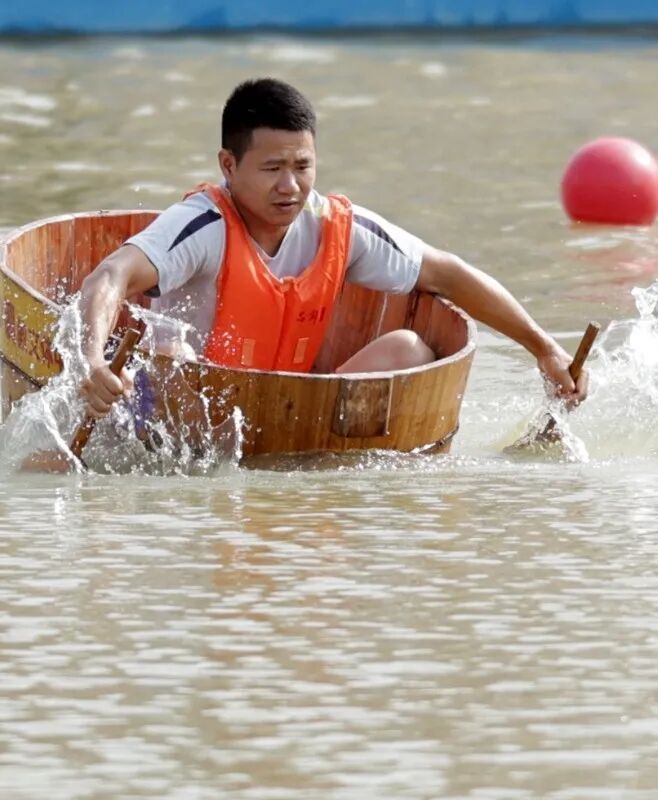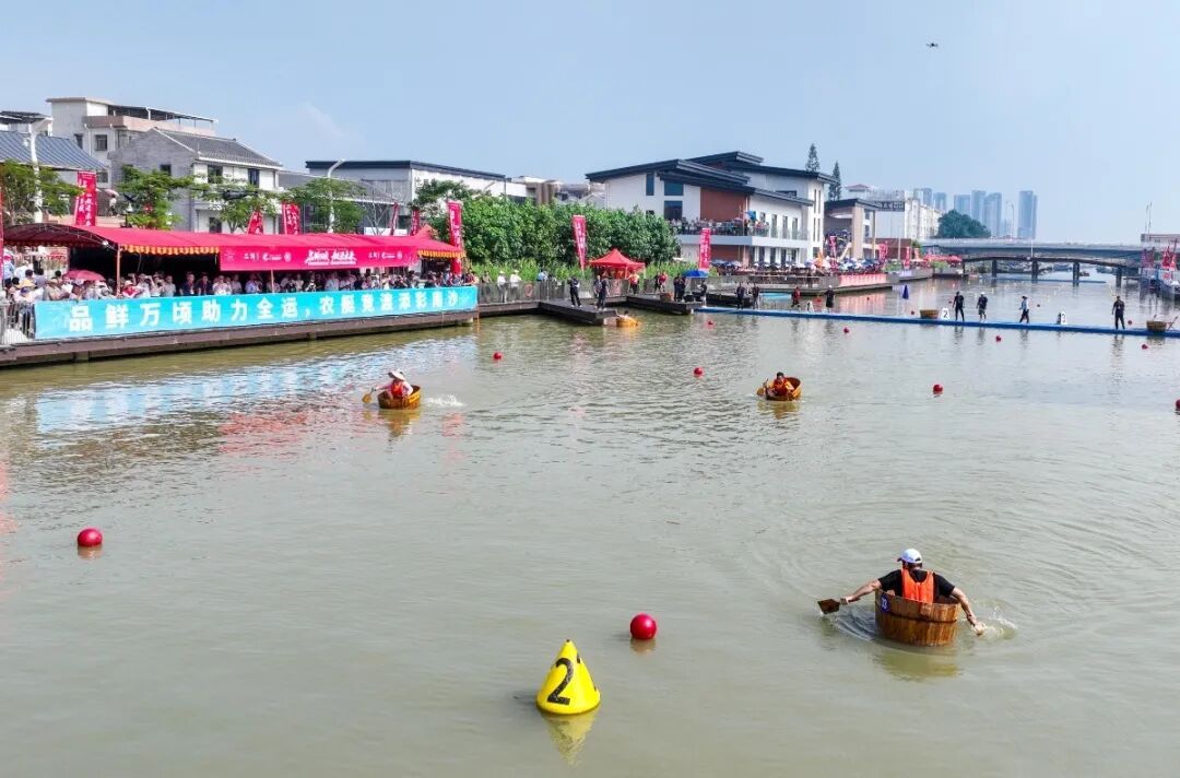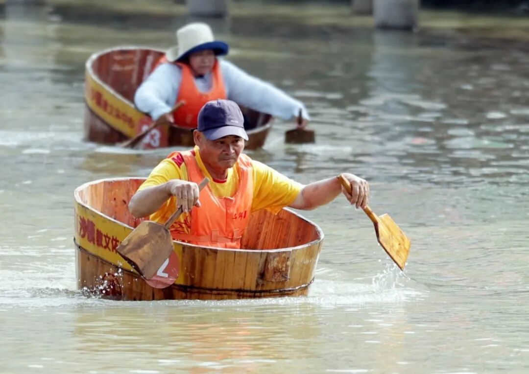 传统农具“禾桶”在选手娴熟的操控下破浪前行,水花飞溅间,欢声笑语与呐喊助威此起彼伏,生动展现了水乡人民勇敢拼搏的精神风貌。